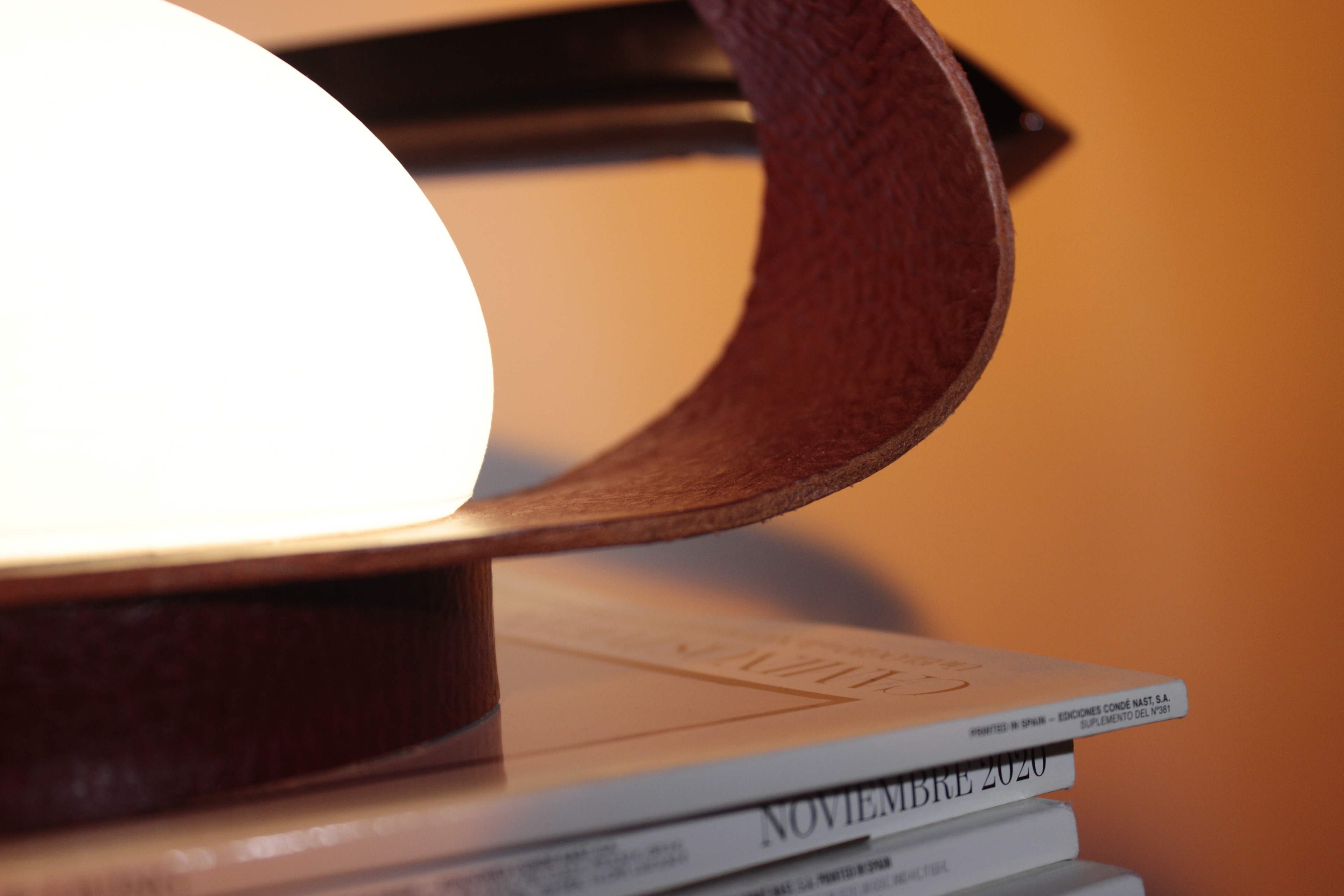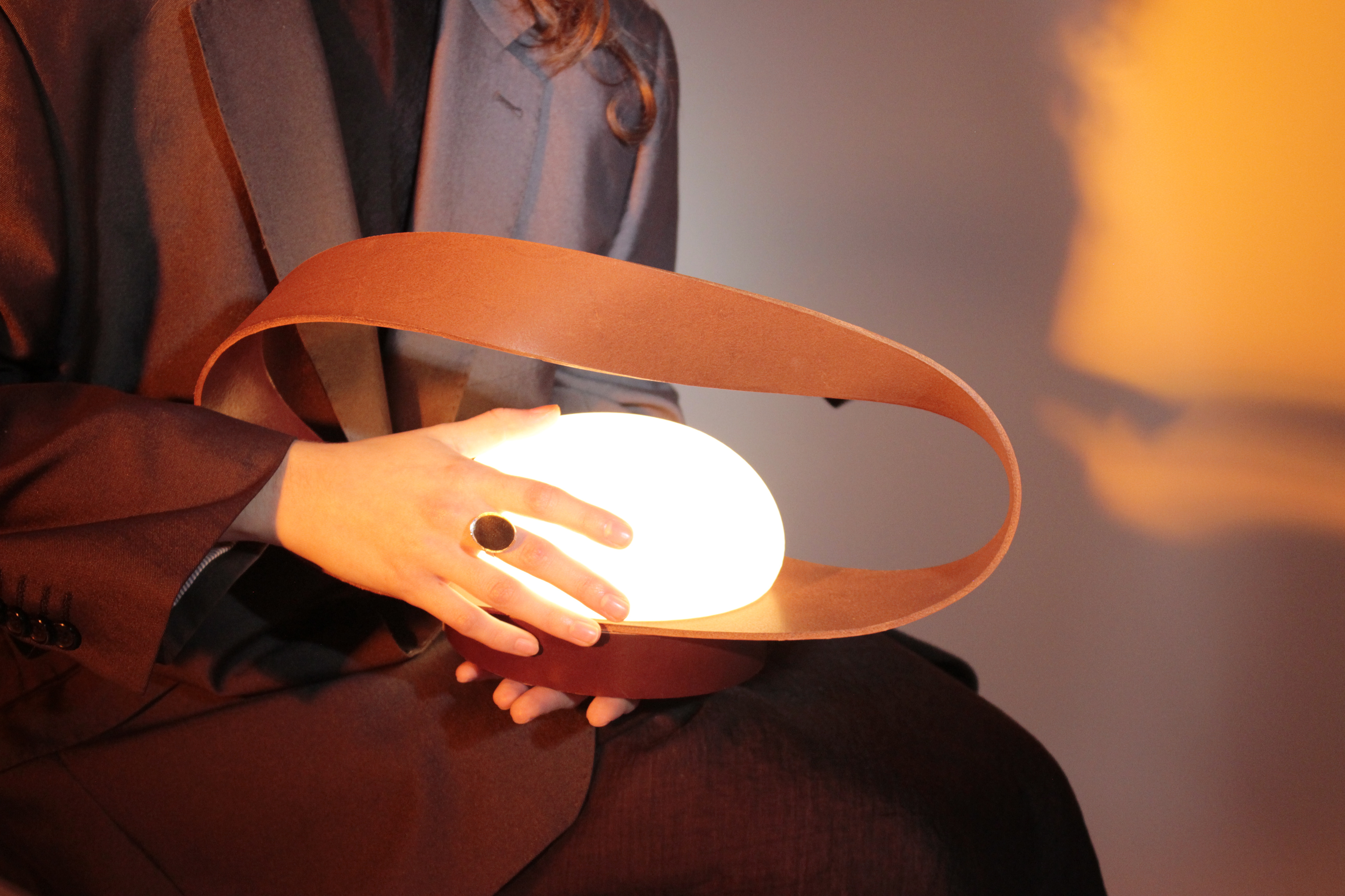 Crafted from noble, flexible leather, it is a portable lamp, tactile and comfortable to carry around as a fashion accessory. Versatile in use, it can be hung as a wall lamp, placed on a table, or set on a shelf. Emitting a warm, living glow that guides you through this infinite flow of light from sunset to sunrise.